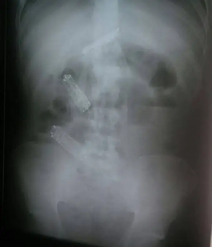 Em um exame raio-X é possível ver os aparelhos em seu estômago. Ele foi medicado com laxantes e voltou à cadeia, mas não conseguiu expelir. Ao retornar ao hospital para fazer uma cirurgia de retirada, passou mal e acabou morrendo.