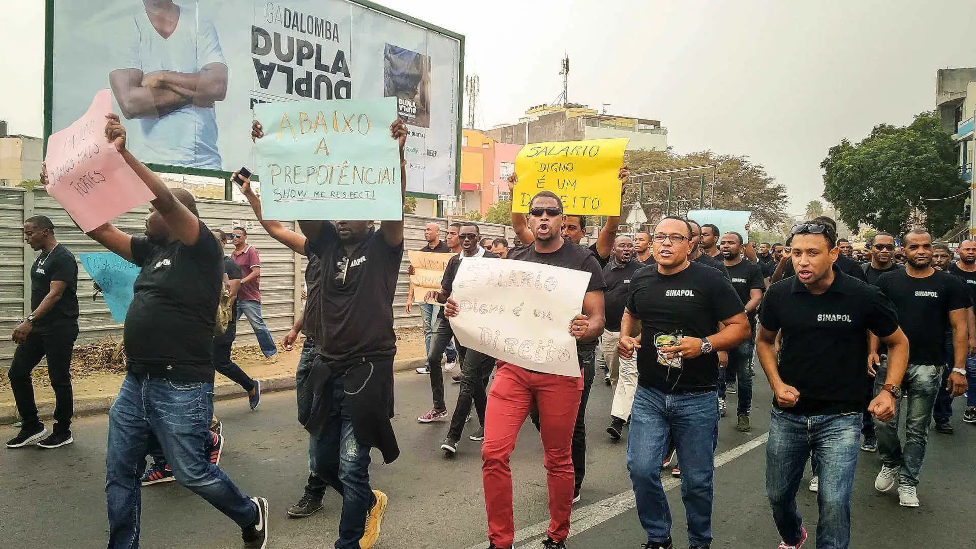 Os policiais, todos vestidos com camisolas negras do sindicato que representa a classe (SINAPOL), seguiram ao som de batucada, apitos e gritavam bem alto, onde se destacava pedidos de respeito e de demissão do ministro da Administração Interna, Paulo Rocha.