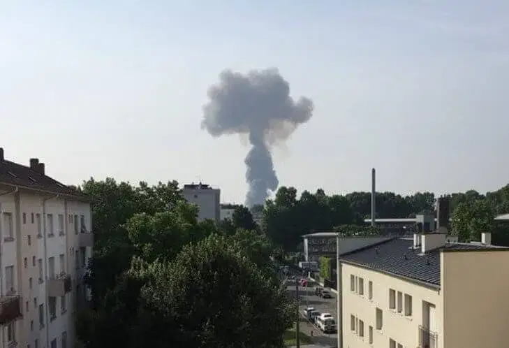 Cerca de 70 bombeiros foram enviados para o local da explosão, que causou uma nuvem de fumo e um incêndio, avançam as autoridades. O fogo no armazém de 2.500 m² permanece activo.