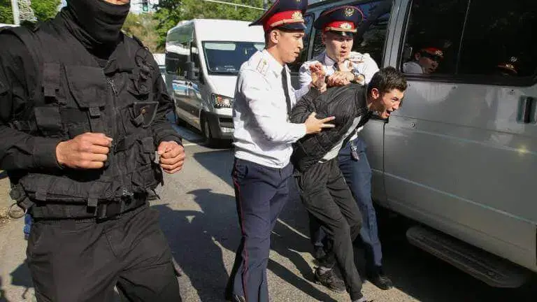 Algumas centenas de pessoas estavam reunidas no parque principal da cidade para protestarem contra os trinta anos de poder do antigo presidente Noursoultan Nazarbaïev, que se demitiu em Março e colocou na liderança do país o seu protegido, Tokaïev.