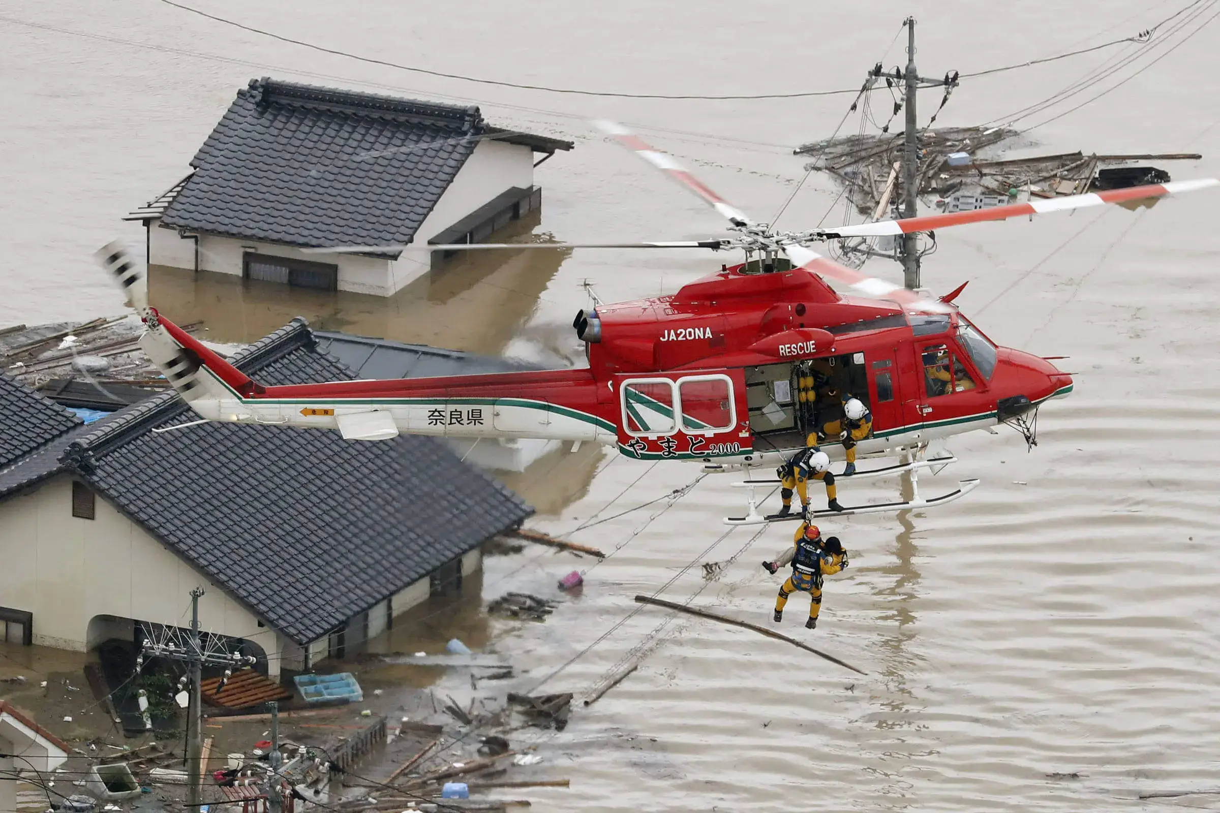 Uma mulher de 70 anos morreu depois de cair cerca de 40 metros de um helicóptero que operava durante as buscas de salvamento no Japão.
