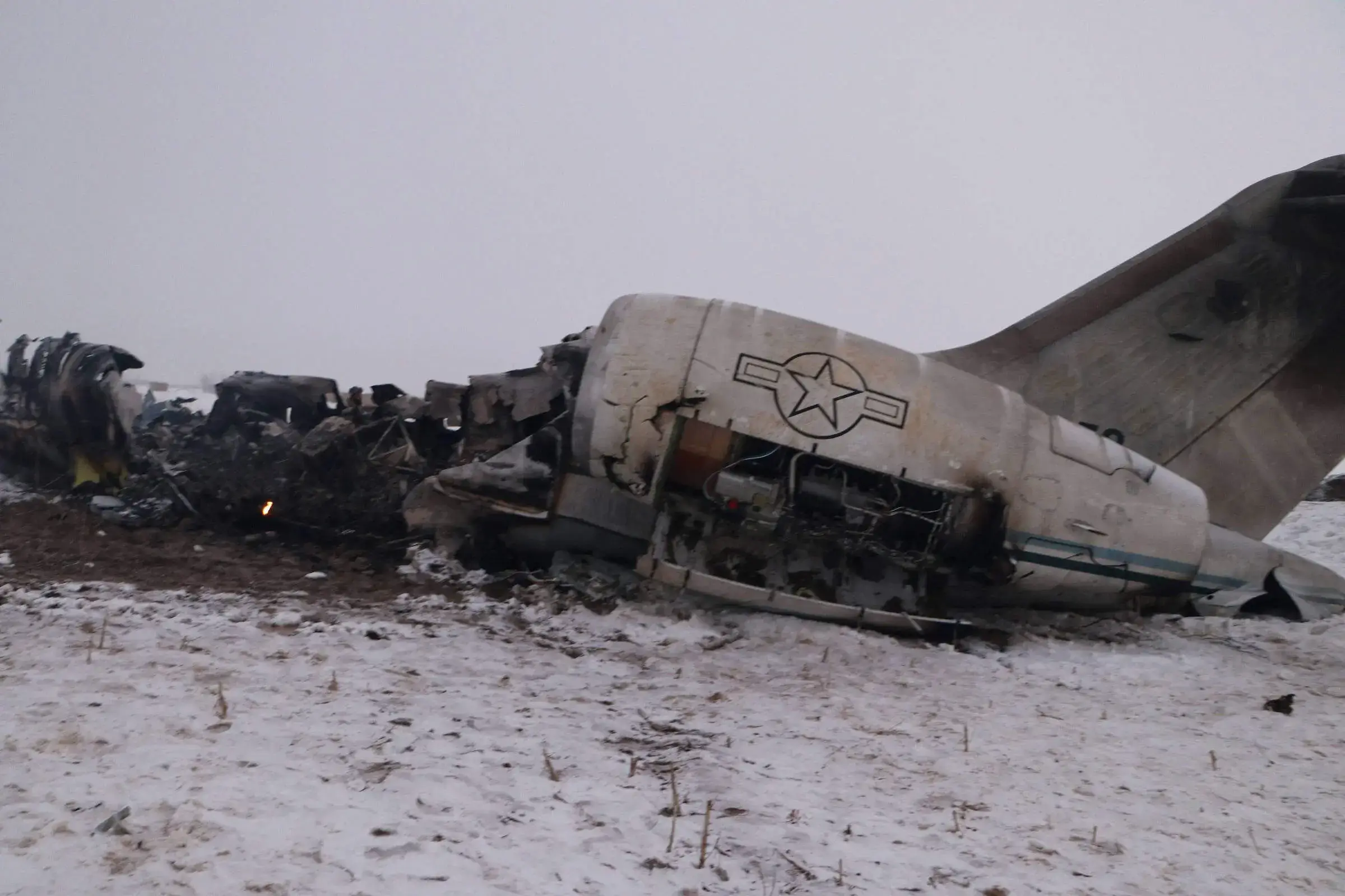 Vídeos divulgados nas redes sociais mostram um avião militar em chamas no meio da neve.