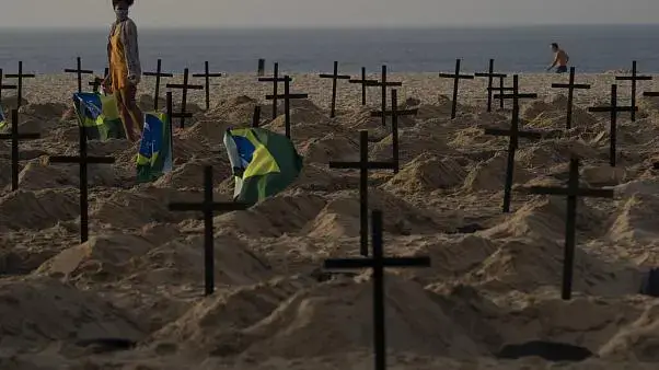 Podia ser um cemitério na praia de Copacabana mas não é. Tratou-se de um protesto contra o que ativistas dizem ser o mau desempenhado dos governos, sobretudo o federal, a lidar com a pandemia de coronavirus.