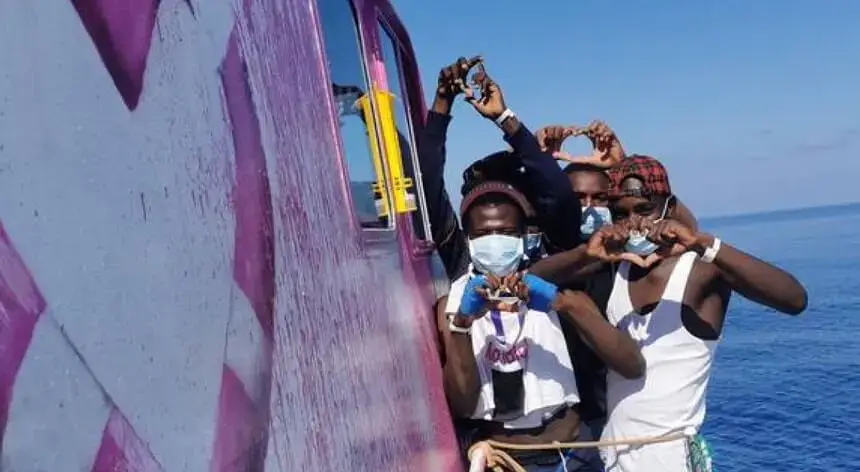O diário britânico publicou várias fotos do barco, pintadas em rosa e branco, com graffiti de Banksy, retratando uma jovem com um colete salva-vidas segurando uma boia em forma de coração.