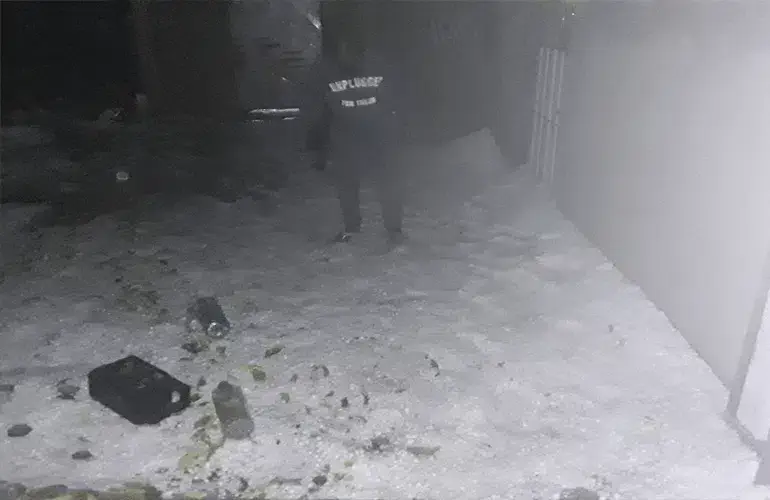 Algumas viaturas atingidas tiveram vidros quebrados e danos na carroçaria devido ao impacto do granizo.