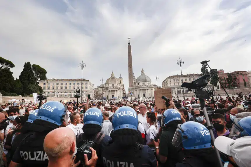Esta terça-feira prosseguiram as manifestações junto à Praça del Popolo. O certificado de vacina vai ser obrigatório no país a partir de 6 de agosto para entrar em bares, restaurantes ou cinemas, mas não para ir ao trabalho ou frequentar transportes.