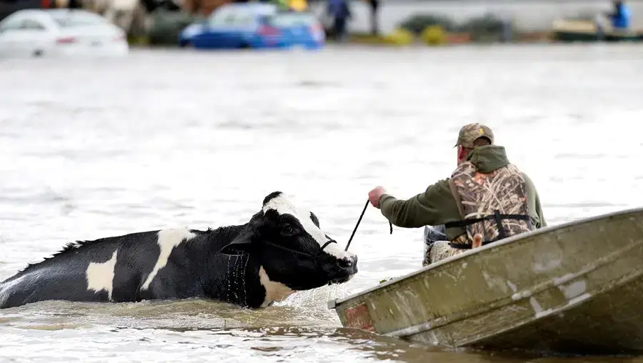 Em Abbotsford, agricultores desesperados usaram barcos e motos de água para tentar resgatar vacas ameaçadas pelas cheias, mas milhares de animais acabaram por morrer.