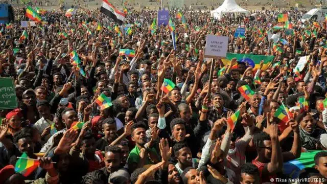 De acordo com os meios de comunicação locais, vários manifestantes presentes na Praça Meskel, no centro da capital Adis Abeba, ergueram bandeiras nacionais e cartazes com mensagens como: “Não precisamos da interferência do estrangeiro”.