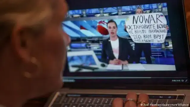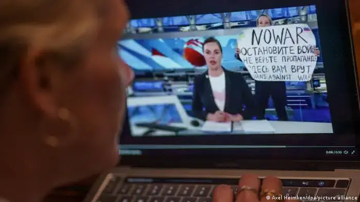 Na segunda-feira (14) à noite, a editora do “Canal Um” interrompeu o noticiário televisivo, o mais visto na Rússia, segurando o cartaz e gritando “não à guerra!”, “parem a guerra!”.
