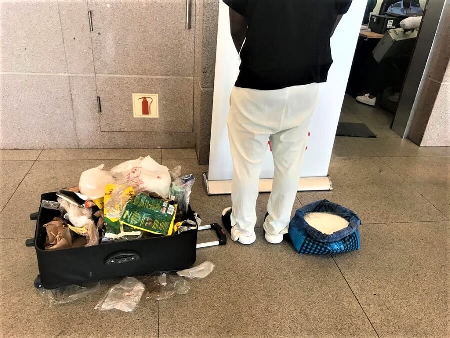 Já no aeroporto, levantou suspeitas quando, ao se aperceber da presença das autoridades policiais e fiscalizadoras, abandonou uma das malas.