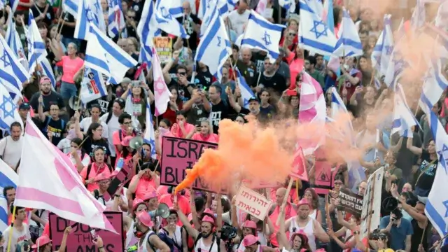 Tal como em anteriores protestos, os participantes marcharam repetindo palavras de ordem como “Não à ditadura” e “A democracia triunfará”, brandiram numerosas bandeiras israelitas e empunharam cartazes com mensagens contra o primeiro-ministro do Governo mais à direita da história de Israel.