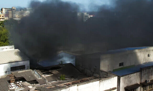 Um incêndio deflagrou três armazéns de uma loja de ferragens na cidade da Beira. Os armazéns pertencem à Adil Stores.