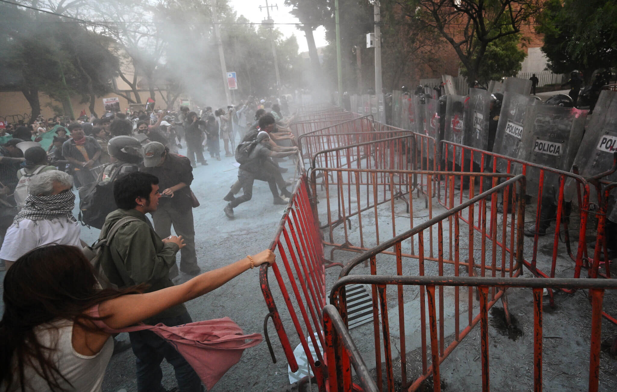 Na terça-feira à noite, os manifestantes, alguns com o rosto coberto, atiraram pedras contra um pelotão de polícias que bloqueava o caminho para o complexo diplomático no bairro de Lomas de Chapultepec.