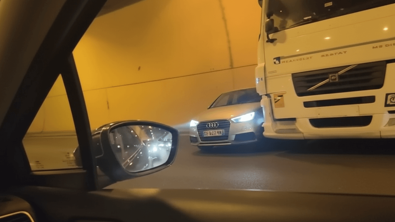 Um incidente insólito ocorreu recentemente no Tunnel des Monts, em Chambéry, perto da fronteira entre França e Suíça, onde um condutor de um Audi A4 foi arrastado por um camião cisterna durante 300 metros sem que tivesse consciência do que acontecia.