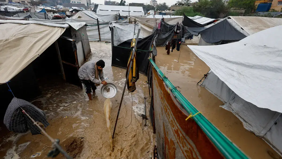 As condições climáticas severas têm provocado o desabamento de várias habitações e danificado numerosas tendas que servem de abrigo a pessoas deslocadas pela ofensiva militar israelita em curso, após os ataques de 7 de Outubro de 2023.